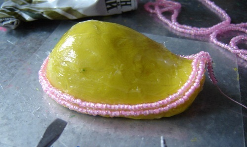 Bước 2: Xỏ hạt cườm vào dây đồng mảnh thành chuỗi dài (có thể dùng cườm màu khác làm viền cánh hoa) rồi quấn thành từng vòng quanh cánh hoa đất nặn từ ngoài vào trong.