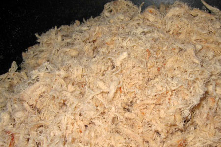 Khi bị phanh phui, kỹ nghệ làm ruốc giả đã khiến nhiều người không khỏi kinh ngạc. Chỉ cần thu gom bã sắn dây từ cơ sở lọc bột sắn thuê về ép, phơi khô, đánh bông, tẩm gia vị, xào cho vàng, trộn với một ít ruốc thật là ra ruốc “nhái” y chang ruốc thịt thực sự. Loại ruốc này được bán ra thị trường với giá chỉ bằng 1/3 giá ruốc thật. |