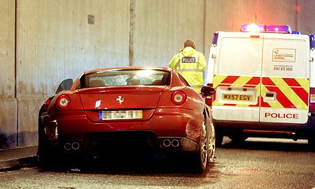 Phần đầu của siêu xe màu đỏ Ferrari 599 GTB bị hư hại nặng nhưng cả hai cầu thủ đều không bị hề hấn gì.
