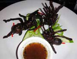 Một tiểu thương bày bán các loài côn trùng, trong đó có loài hồng quân mà nhiều người lầm tưởng là… nhện hùm. |