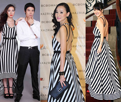 ![]() Chung Thục Quyên, Dương Yến Ngọc và Hồng Nhung bất ngờ "mặc chung" một chiếc váy mullet kẻ sọc rất bắt mắt. Họa tiết kẻ sọc đem lại vẻ đẹp trẻ trung đồng thời đường khoét rộng phía sau lưng lại tôn thêm nét quyến rũ cho 3 người đẹp |