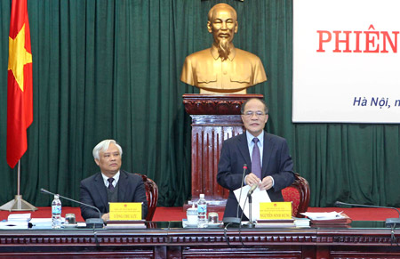 Chủ tịch Quốc hội Nguyễn Sinh Hùng chủ trì phiên họp lần thứ hai Ủy ban dự thảo sửa đổi Hiến pháp năm 1992. Ảnh: TTX |