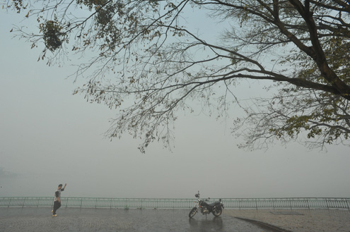 ![]() 9h, nắng lên nhưng sương vẫn bao phủ trên mặt hồ Trúc Bạch. |