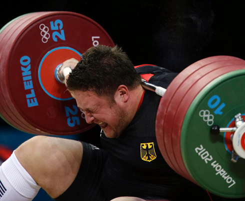 Sau khi bị mất thăng bằng, VĐV cử tạ người Đức Matthias Steiner ngã khuỵu xuống sàn, bị tạ đè lên người và mặt...