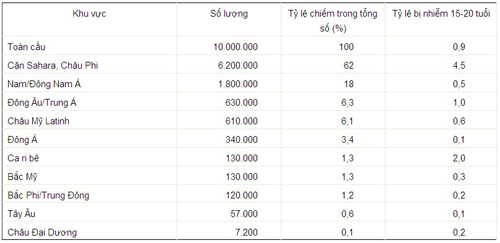 • Khu vực Cận Sahara, châu Phi thanh niên 15 - 24 tuổi có tỷ lệ nhiễm HIV/AIDS cao nhất, tiếp theo là khu vực Ca ri bê và Đông Âu/Trung Á (xem bảng 2). 1,5 ở một số nước, tỷ lệ nhiễm HIV trong những người trẻ tuổi cao hơn rất nhiều. Gần đây, điều tra đại diện hộ gia đình cấp quốc gia ở Nam Phi cho thấy tỷ lệ này trong thanh niên 15 - 24 tuổi là 10,2%, phụ nữ trẻ chiếm tỷ lệ (15,5%) cao hơn so với nam giới trẻ (4,8%).