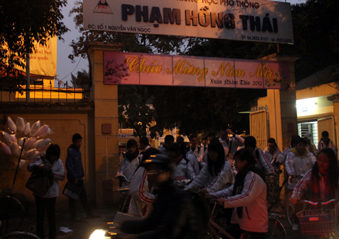 Đúng 18h, tiếng trống báo tan học vang lên, hàng trăm học sinh ùa ra khỏi cổng trường. Nguyễn Hữu Thái Luân (lớp 10D1, THPT Phạm Hồng Thái) cho biết, hôm nay tan sớm hơn những ngày trước nên cảm thấy đỡ mệt. Đi bộ về nhà, Luân có thể tắm rửa, ăn cơm rồi ngồi vào bàn học.