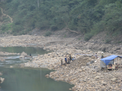 Sau khi thủy điện Bản Vẽ ngăn dòng, phía hạ lưu dòng Nậm Nơn trơ trọi lòng sông và người dân lại đi khai thác vàng. |