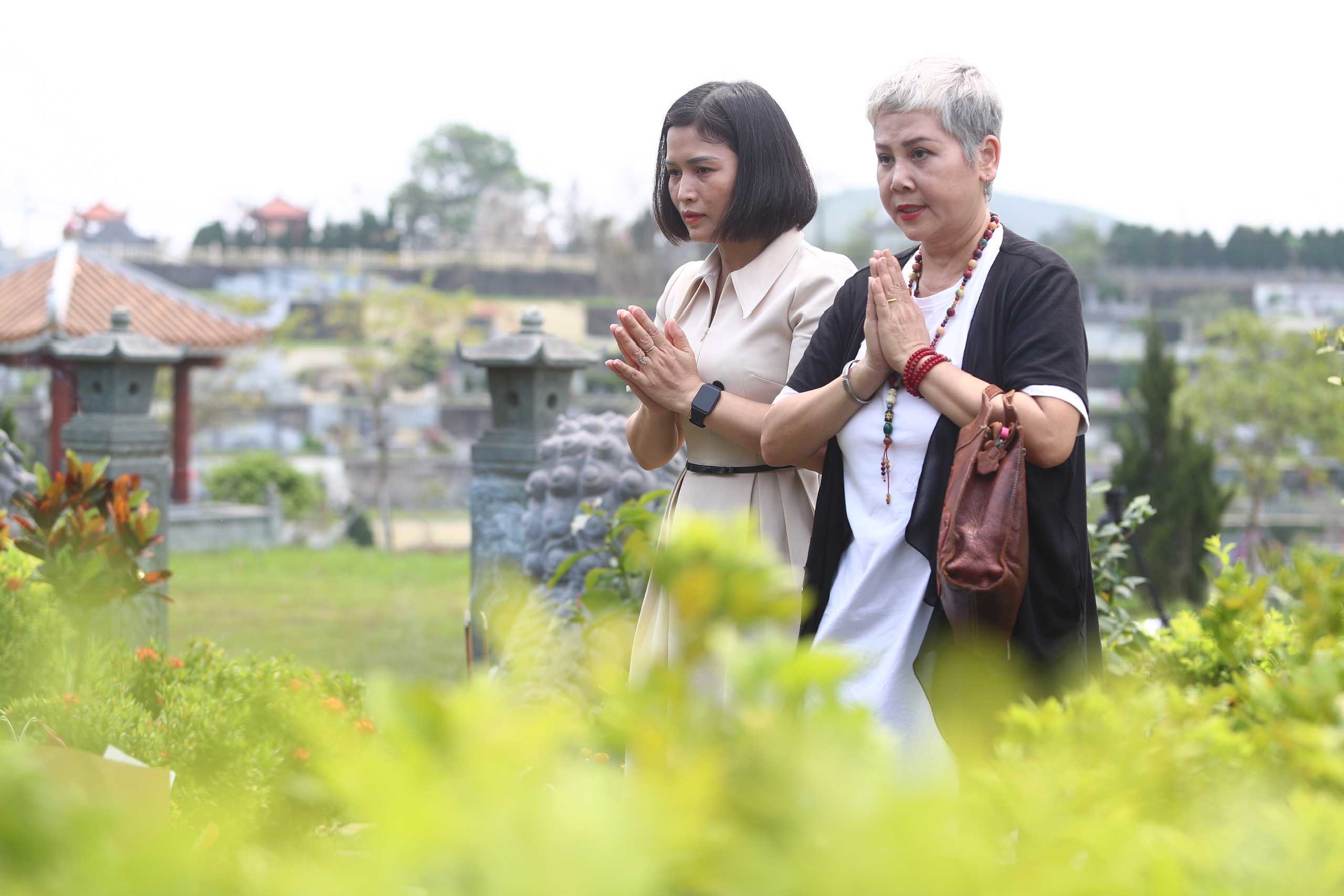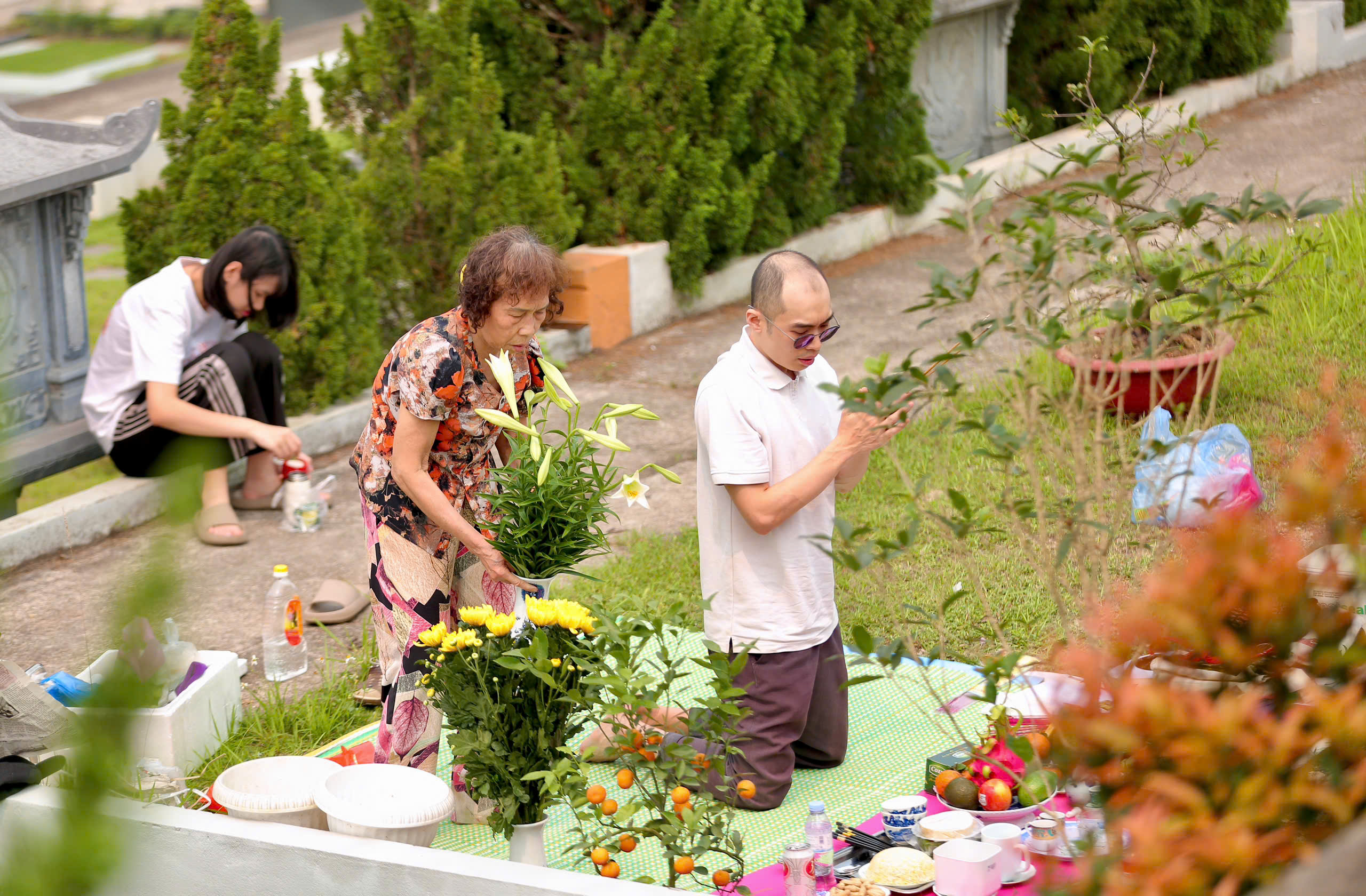 NSND Minh Hằng cùng người thân trò chuyện sau khi thực hiện nghi lễ Tết Thanh Minh tại mộ phần.