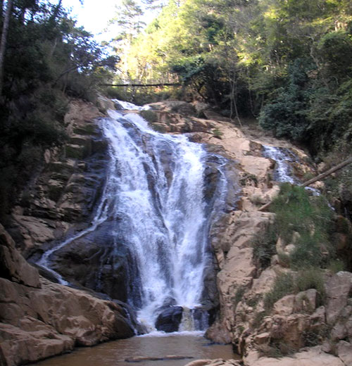 Dã quỳ hoa vàng rực rỡ từng vạt dài, điểm xuyến giữa màu xanh chập chùng như cảnh thần tiên. Mimosa nhẹ nhàng, quý phái, e ấp giữa núi rừng hoang dã càng tăng thêm nét lãng mạn của cao nguyên. Khu du lịch sinh thái thác Hang Cọp hiện ra trước mắt chúng ta với dáng vẻ hoang sơ, hùng vĩ và thơ mộng. |