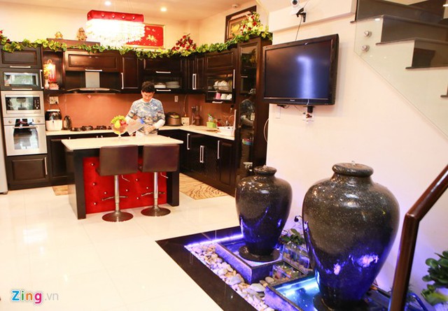 Điểm nhấn phòng bếp là 2 bình gốm anh mới tậu để hợp phong thủy. Tiếng nước chảy róc rách tạo cảm giác vui tai cho ngôi nhà.