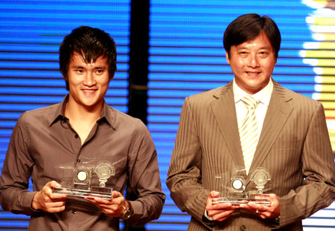 ![]() Hai người từng 3 lần đoạt danh hiệu Quả bóng Vàng Lê Huỳnh Đức (HLV CLB Đà Nẵng) và Lê Công Vinh (đội T&T) nhận kỷ niệm chương của Ban tổ chức bình chọn - Báo Sài Gòn Giải Phóng. |