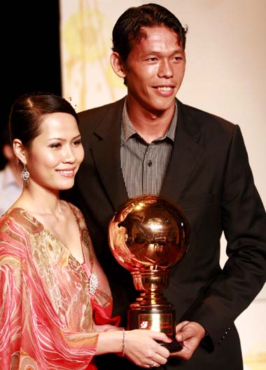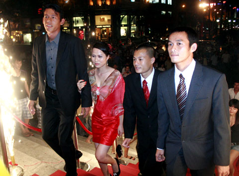 ![]() Chủ nhân danh hiệu Quả bóng Vàng 2009 Thành Lương và Quả bóng Bạc Vũ Phong (phải) chỉ một mình đến nhận giải thưởng ở Nhà hát TP HCM tối thứ hai, trong khi Quả bóng đồng, thủ môn Tấn Trường, sánh đôi cùng người yêu Ngọc Liên. |