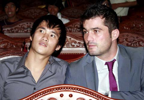 ![]() Cầu thủ trẻ hay nhất - tiền vệ Trọng Hoàng (SLNA), và Cầu thủ ngoại xuất sắc - tiền đạo Merlo (Đà Nẵng) nhận phần thưởng từ HLV Calisto. |