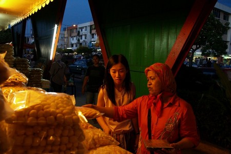 Wet market tại Kota về đêm với đặc sản là các loại bánh phồng. |