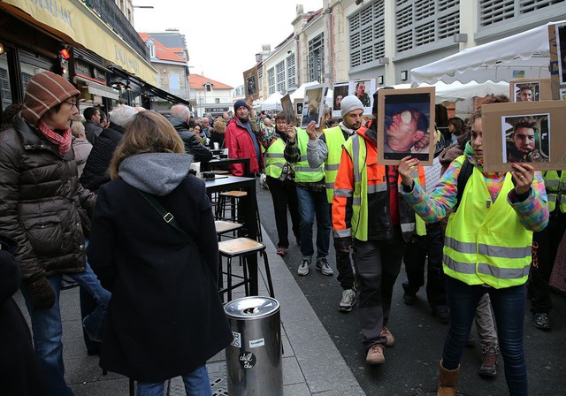 Tại thị trấn Biarritz, phía nam nước Pháp , những người ủng hộ phong trào "áo khoác vàng" tiếp tục các cuộc tuần hành. Trong tuần thứ bảy liên tiếp phong trào diễn ra trên toàn nước Pháp, họ lên án việc cảnh sát hành hung người biểu trong những tuần trước. Ảnh: AP.