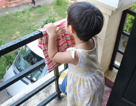![]() Không nên để trẻ một mình ở lan can trên nhà cao tầng.