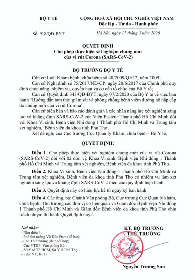 Quyết định số 918/QĐ-BYT của Bộ Y tế nêu rõ, Bộ Y tế cho phép 2 đơn vị: Khoa Vi sinh, Bệnh viện Nhi Đồng 1 Thành phố Hồ Chí Minh và Trung tâm xét nghiệm, Bệnh viện Đa khoa tỉnh Phú Thọ.