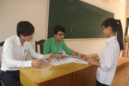 Thí sinh làm thủ tục dự thi tại Trường ĐH Công đoàn sáng 8/7. |