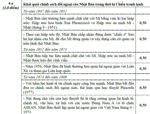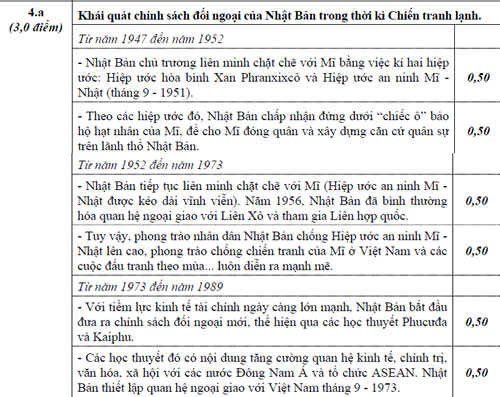 Thứ hai, đáp án xác định thời gian kết thúc Chiến tranh lạnh là năm 1989 nhưng vẫn nêu Học thuyết Kaiphu (do Thủ tướng Khaiphu đưa ra năm1991) là chưa chuẩn. Sai sót này đã được Bộ GD&ĐT điều chỉnh lại trong đáp án mới. Thứ ba, khi trình bày chính sách đối ngoại của Nhật Bản trong thời kỳ Chiến tranh lạnh, bên cạnh sự duy trì quan hệ với Mỹ và Tây Âu, đường lối đối ngoại quan trọng của Nhật là "sự trở về châu Á" (đặc biệt là với Đông Nam Á) là một nội dung cơ bản nhưng lại không được đề cập trong đáp án.