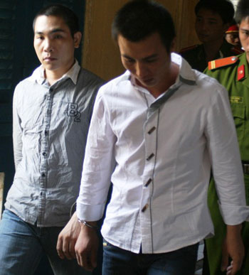 | Bị cáo Nguyễn Văn Cường (áo trắng) và Hợp đang bị giải ra xe về nhà giam. |