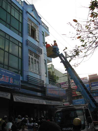 Xe thang của ngành điện lực đang đưa thi thể anh Vinh treo lủng lẳng trên dây xuống. Ảnh: Đ.H |