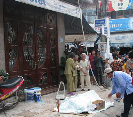 GiadinhNet - Khi đang đu mình trên dây thừng tiến hành sơn mặt tiền tầng 3 của một khách sạn, anh Vinh bị đường dây điện trung thế 22kVA phóng điện làm tử vong treo lủng lẳng trên dây.