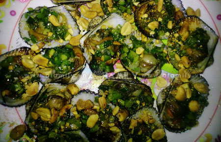 Món sò lông nướng bình thường nhưng khi chấm với vị của nước chấm ớt xanh thì bỗng nhiên trở thành một món ăn khác hẳn với vị vừa là lạ lại vừa quen. |
