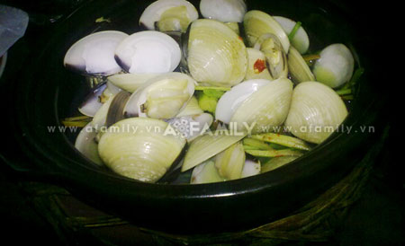 Nghêu hấp xã luôn được đựng trong thố và có hương vị đặc trưng của món. |