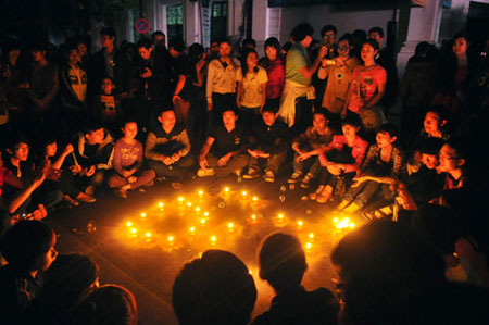 Tại quảng trường Cách mạng tháng Tám, giới trẻ đổ về hưởng ứng và thắp lên những ngọn nến. |