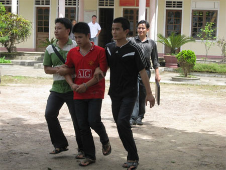 Trần Hoàng Trung (áo đỏ) đã bị bắt. Ảnh: LTG |