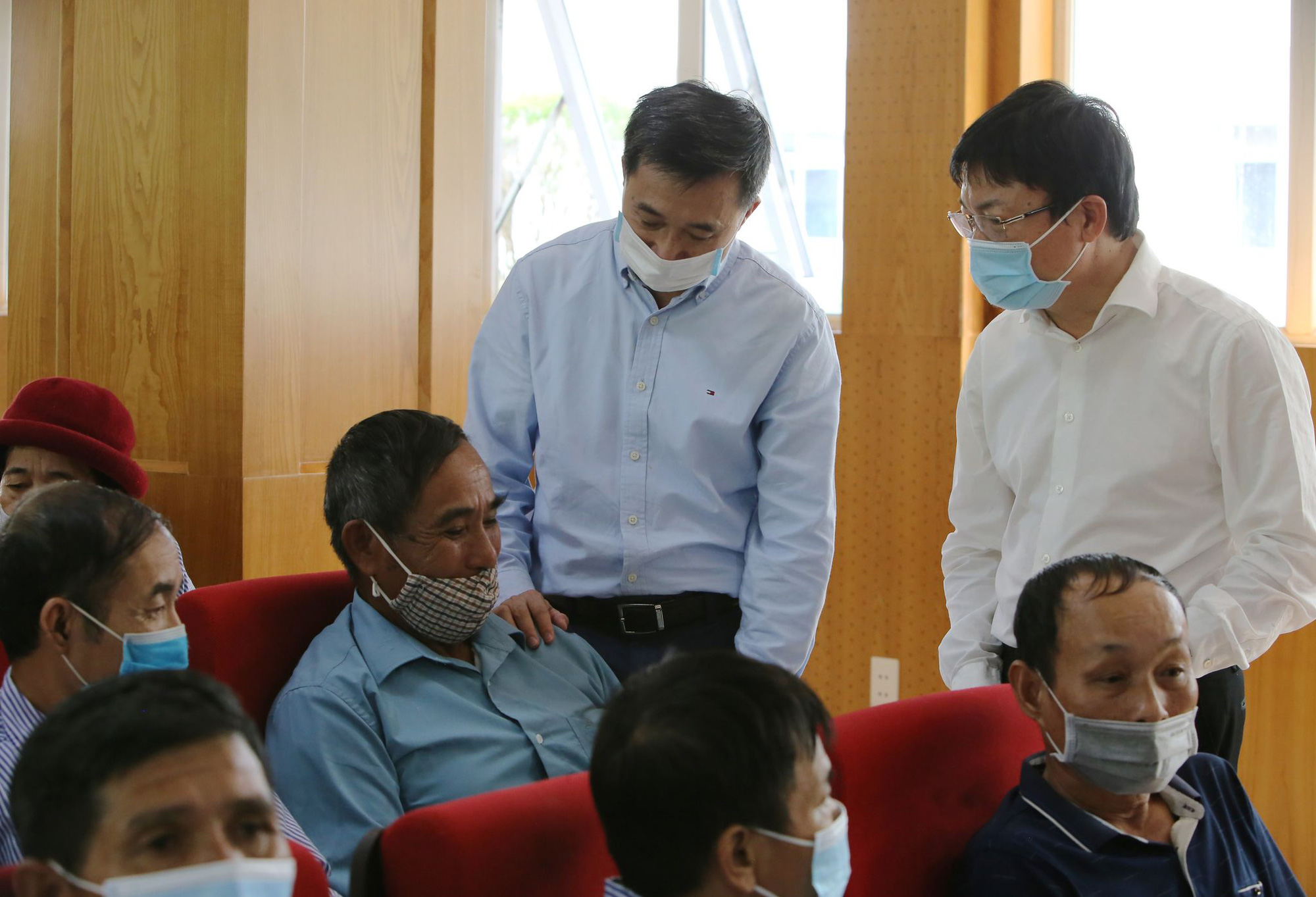 Thứ trưởng Bộ Y tế Trần Văn Thuấn (trái) thăm hỏi người dân Quảng Bình chịu ảnh hưởng bởi đợt mưa lũ lịch sử.