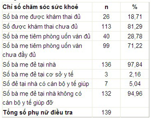 Công tác chăm sóc trước khi sinh cho các bà mẹ Mông chưa tốt: Tỷ lệ các bà mẹ được khám thai, tiêm phòng uốn ván rất thấp (18,71% & 28,78%). Công tác chăm sóc trong sinh cũng chưa được chú ý: Tỷ lệ bà mẹ đẻ tại nhà rất cao (97,84), trong khi đó chủ yếu các bà mẹ đẻ tại nhà không có cán bộ y tế giúp đỡ (94,96%).