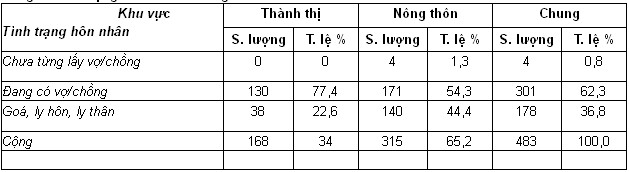 Số liệu bảng 2 cho thấy: Người cao tuổi ở khu vực thành thị đang có vợ hoặc chồng có tỷ lệ là 77,4%, ở khu vực nông thôn là 54,3%. Đặc biệt lưu ý số người cao tuổi goá vợ, ly hôn, ly thân ở Hà Tây có tỷ lệ khá cao (36,8%). Trong đó ở khu vực thành thị là 22,6% ở khu vực nông thôn người cao tuổi goá, ly hôn, ly thân có tỷ lệ rất cao (44,4%). Tình hình này cho thấy cần phải có giải pháp chăm sóc sức khoẻ cho người cao tuổi bị cô đơn có hoàn cảnh khó khăn.