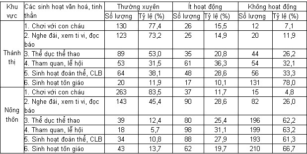 Số liệu cho thấy: Người cao tuổi ở khu vực thành thị, sử dụng các phương tiện truyền thông: Đài, ti vi, sách báo và máy vi tính đều có tỷ lệ cao hơn người ở khu vực nông thôn. Người cao tuổi chủ yếu nghe đài và xem ti vi.