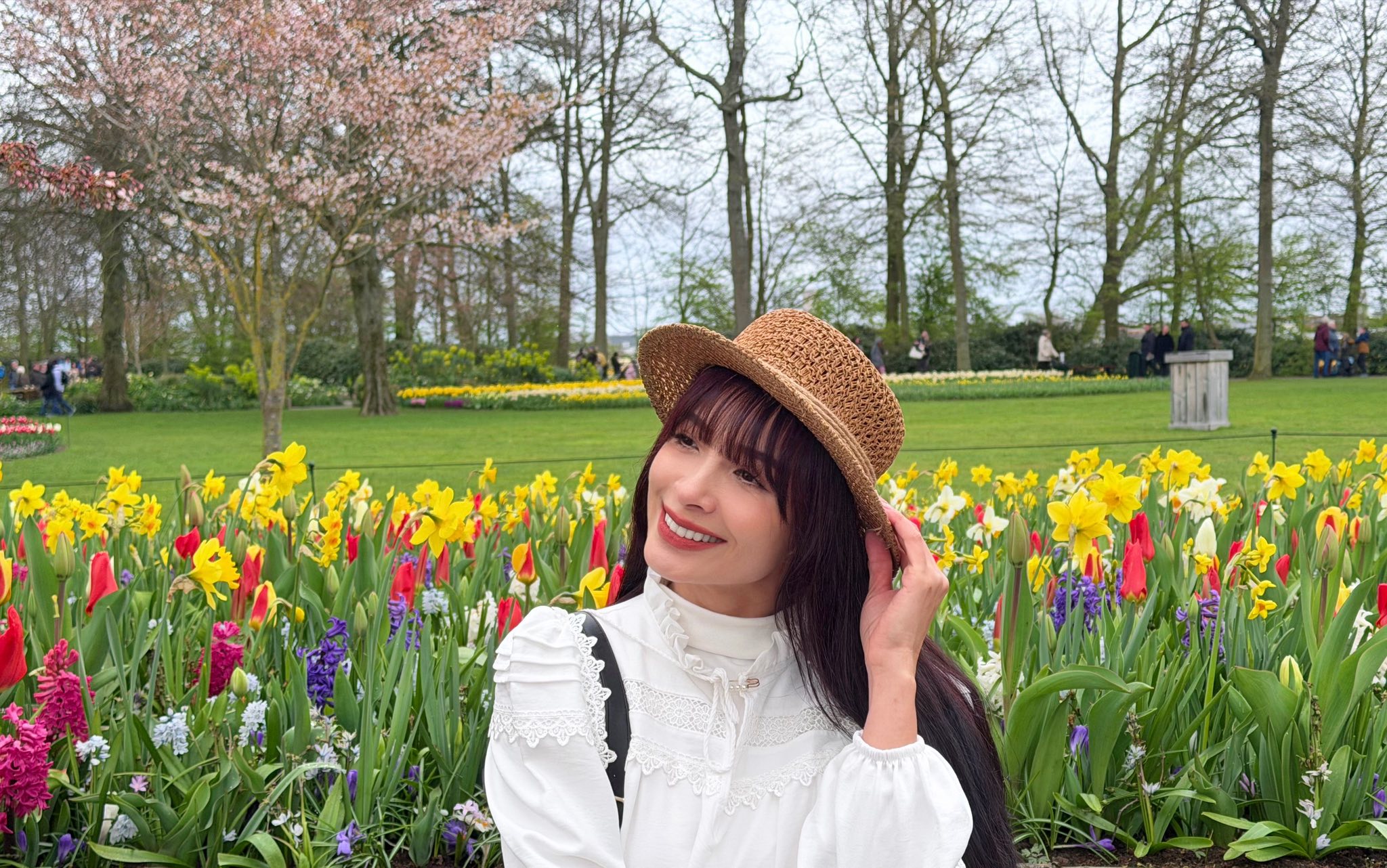 Thúy Hạnh khoe khoảnh khắc chụp cùng hoa tulip ở châu Âu. Cựu siêu mẫu cho biết chị đang ở nước ngoài cùng con gái.
