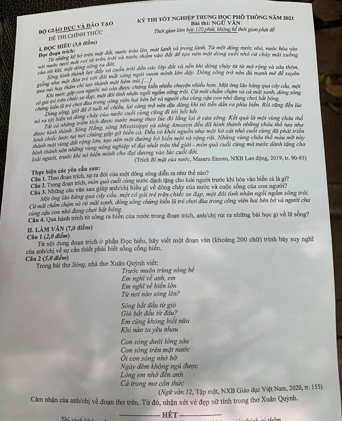Thí sinh thích thú với lẽ sống và sống cống hiến được đưa vào đề thi Ngữ văn tốt nghiệp THPT năm 2021 Sau khi thí sinh hoàn thành môn thi Ngữ văn, kỳ thi tốt nghiệp THPT năm 2021, TS Trịnh Thu Tuyết, nguyên giáo viên Ngữ văn trường THPT Chu Văn An (Hà Nội) cho biết, đề thi chính thức môn Ngữ văn trong kì thi tốt nghiệp THPT năm 2021 đảm bảo đúng các yêu cầu về nội dung, hình thức của một đề thi tốt nghiệp THPT.