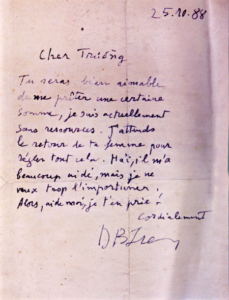 Bức thư được đề ngày 25/10/1988, chỉ vài ngày sau đó, danh hoạ Dương Bích Liên vĩnh viễn rời bỏ cõi trần. Ông Trường kể lại rằng, những ngày cuối đời sống trong đau yếu, bệnh tật lại không vợ, không con nên ngoài một số ít người bạn thân, Dương Bích Liên chỉ còn biết trông chờ vào nguồn viện trợ từ người em rể làm bác sĩ bên Pháp (lúc đó, em gái Dương Bích Liên đã mất). Thời điểm bức thư này được gửi đến Nguyễn Trường thì vợ ông Trường lúc đó đang công tác bên Pháp chuẩn bị về nước. Người em rể làm bác sĩ chắc chắn sẽ gửi tiền qua vợ của Nguyễn Trường về cho Dương Bích Liên nên hoạ sĩ chỉ nhằm ý mượn tạm một khoản tiền lo thuốc thang, ngay khi có tiền từ Pháp về sẽ gửi trả ngay.