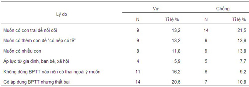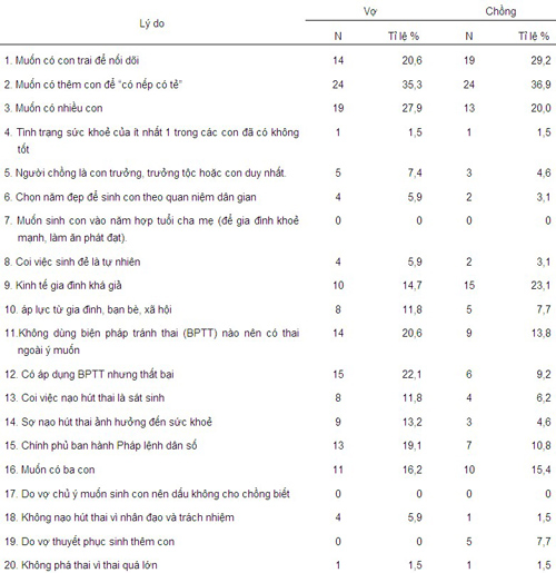 Từ bảng 1 cho thấy lý do hàng đầu mà các cặp vợ chồng đưa ra là “muốn có thêm con để có nếp có tẻ” lý do số 2. Tiếp đó là lý do 1 (muốn có con trai) và lý do 3 (muốn có nhiều con). Có một số sự khác biệt giữa những lý do sinh con thứ 3 của vợ và chồng: với lý do 9 (kinh tế) thì có tới 23,1% người chồng đưa ra nhưng chỉ có 14,7% ở người vợ, với lý do 15 (Pháp lệnh Dân số) thì chỉ có 10,8% người chồng đề cập nhưng có tới 19,1% người vợ đưa ra lý do này. Đáng lưu ý là có một tỉ lệ khá cao những người vợ cũng như những người chồng đưa ra lý do 11 và 12 (có thai ngoài ý muốn do không dùng hoặc thất bại trong sử dụng BPTT), đó là những yếu tố liên quan tới công tác tuyên truyền, tư vấn, và phần nào là chất lượng dịch vụ KHHGĐ.
