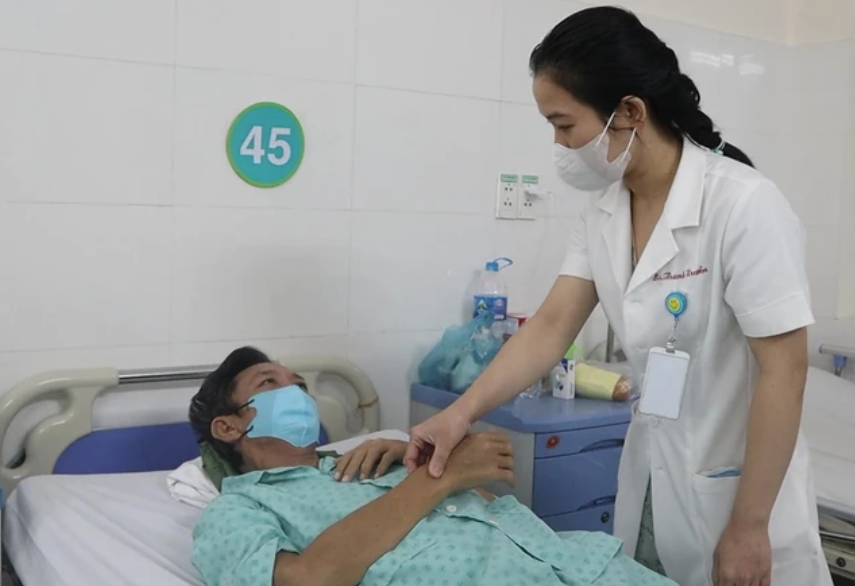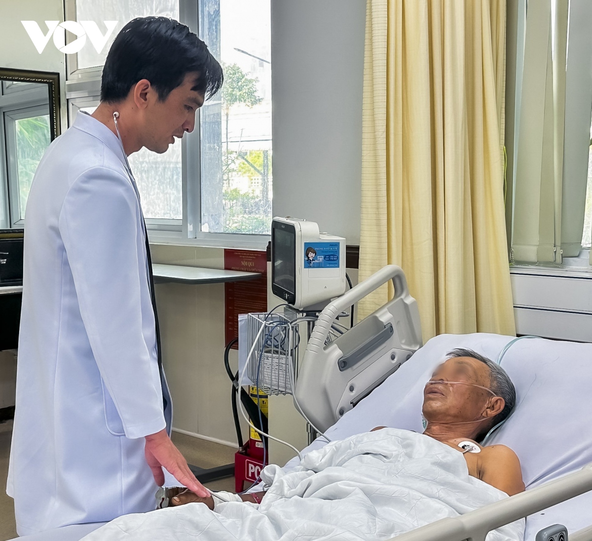 Bác sĩ thăm khám cho cụ ông sau can thiệp.