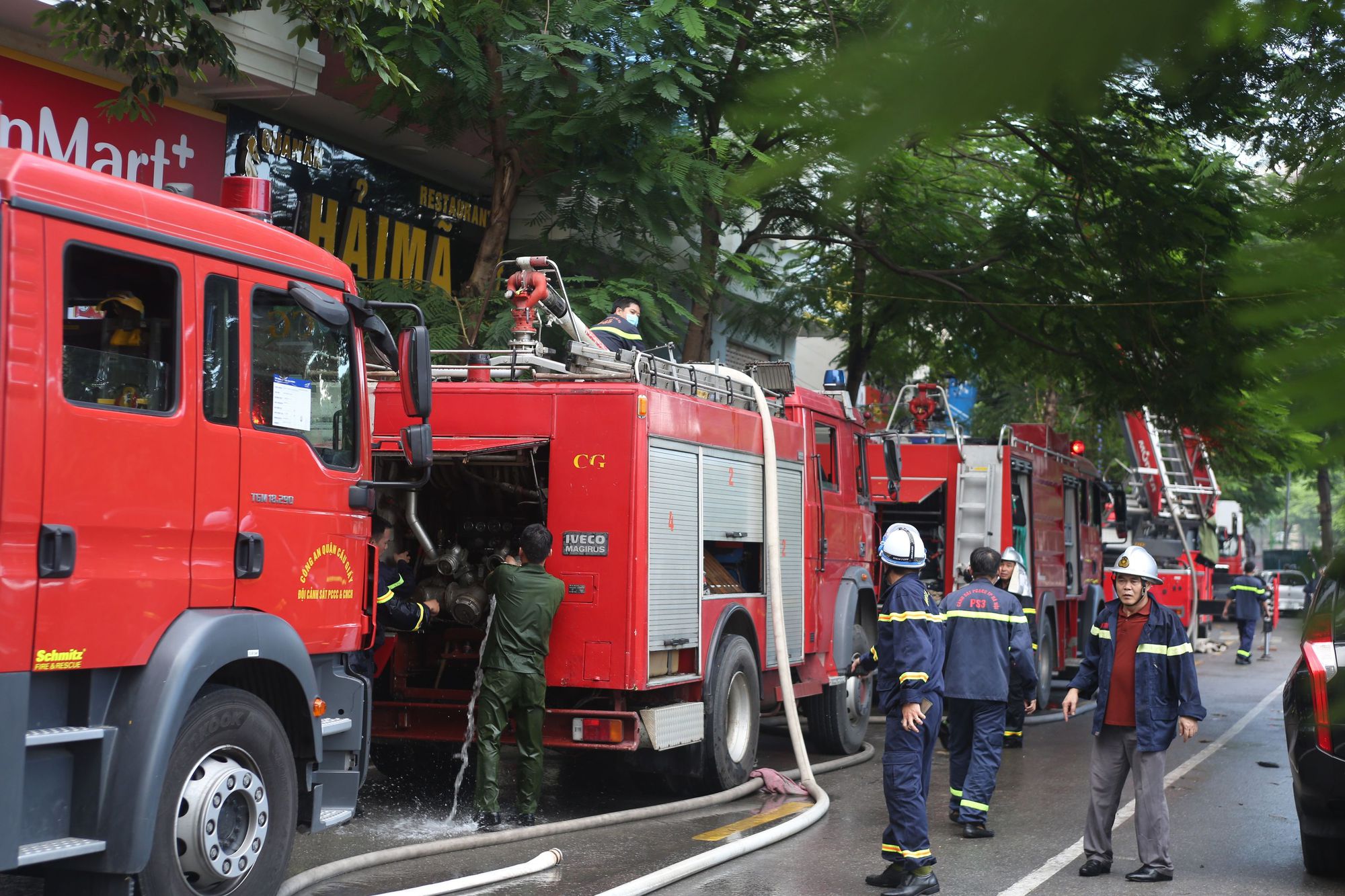 Công tác chữa cháy được khẩn trương triển khai tại hiện trường vụ cháy quán karaoke số 231 Quan Hoa (quận Cầu Giấy, Hà Nội).