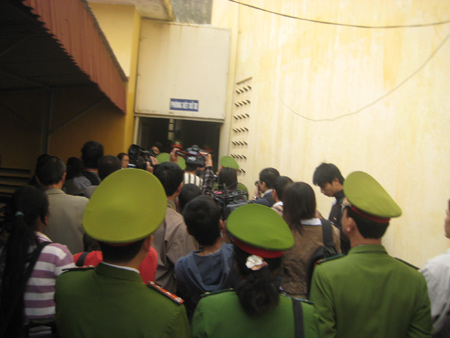 8:5 Nguyễn Đức Nghĩa đã được dẫn vào phòng xét xử. Phòng xử tại tòa phúc thẩm (phố Đội Cấn, Hà Nội) hôm nay khá nhỏ, đông đảo phóng viên và người dân phải ở ngoài, không được vào trong tham dự xét xử.