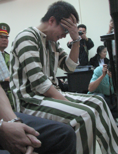 Nguyễn Đức Nghĩa bật khóc nức nở tại phiên tòa khi nghe tin bố mất. Ảnh: Quốc Tuấn (chụp lúc 9 giờ 50 phút) |