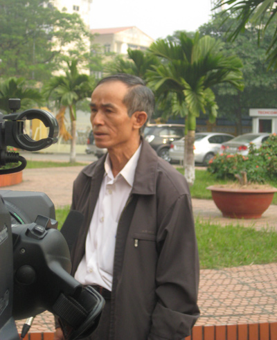 Ông Nguyễn Văn Ba - bố nạn nhân Nguyễn Phương Linh - trả lời phóng viên báo chí sáng nay - trước khi bước vào phòng dự xét xử. Ảnh: Việt Anh |