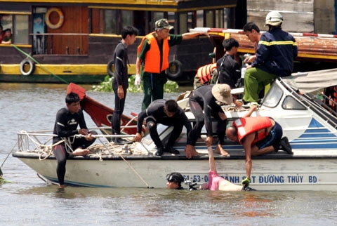 13:50 7 người xấu số khác được đưa lên khỏi xác tàu. Trong đó có hai nạn nhân người Trung Quốc đã được xe cứu thương đưa thẳng về TP HCM. Các nạn nhân đều còn nguyên vẹn. Riêng một phụ nữ bị trôi hết quần áo khiến lực lượng cứu nạn vô cùng đau xót, tìm vội mảnh vải phủ kín cho chị rồi chuyển lên cano đưa vào bờ.