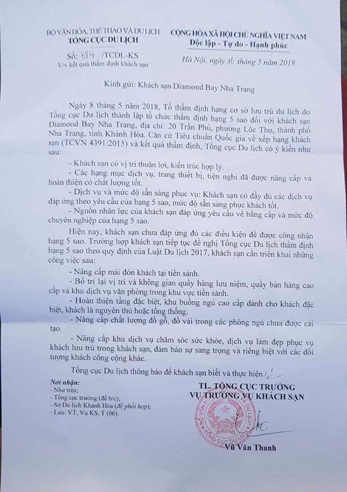 Công văn số 584/TCDL-KS của Tổng cục Du lịch cho biết, ngày 8 tháng 5 năm 2018, Tổ thẩm định hạng cơ sở lưu trú du lịch do Tổng cục Du lịch thành lập tổ chức thẩm định hạng 5 sao đối với khách sạn Diamond Bay Nha Trang, có địa chỉ ở 20 Trần Phú, phường Lộc Thọ, TP. Nha Trang, tỉnh Khánh Hòa. Căn cứ Tiêu chuẩn Quốc gia về xếp hạng khách sạn (TCVN 4391:2015) và kết quả thẩm định, Tổng cục Du lịch kết luận: "Hiện nay, khách sạn chưa đáp ứng đủ các điều kiện để được công nhận hạng 5 sao".
