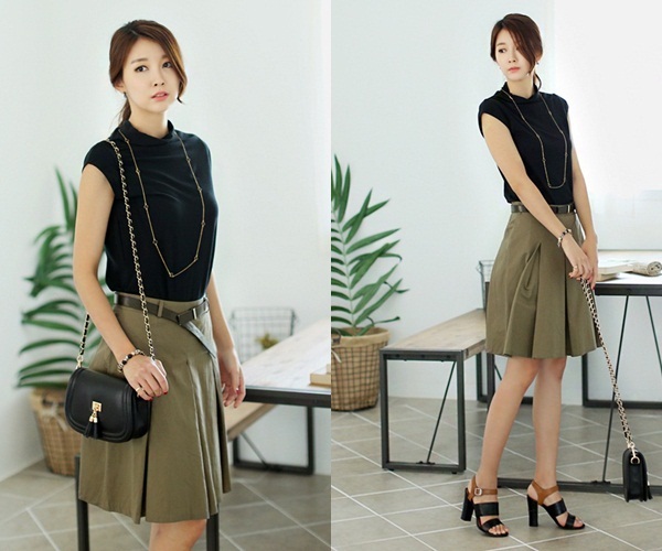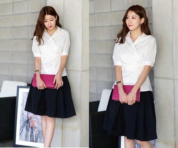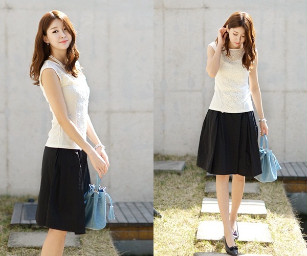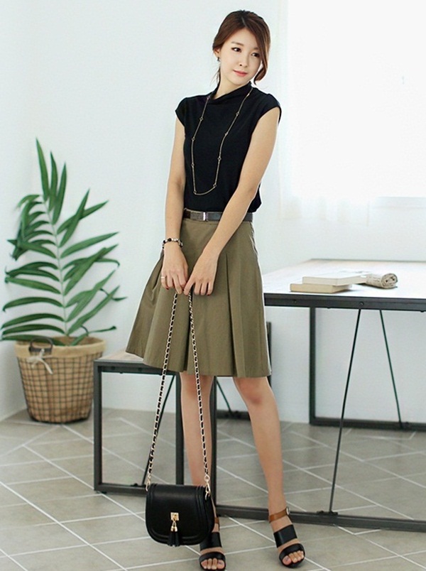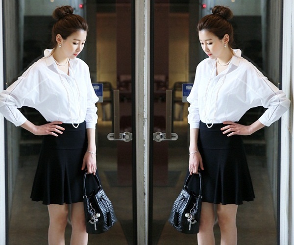 Bộ đôi trắng – đen chưa bao giờ bị lạc điệu với thời trang. Chân váy chữ A tông đen kết hợp cùng áo trắng tinh khôi sẽ giúp chủ nhân tôn dáng và nổi bật chốn đông người. Không chỉ vậy, chân váy chữ A còn giúp bạn ăn gian kích thước cho vòng 3 khiêm tốn hay vòng 2 kém thon, trong khi áo trắng giúp nổi bật phần thân trên. Vì vậy mà, set đồ này được coi là “món quà” dành cho dáng người quả táo, tám giác ngược hay dáng thước kẻ.