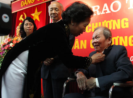 Phó Chủ tịch nước Nguyễn Thị Doan gắn Huân chương Độc lập hạng Nhất cho Giáo sư Mai Kỷ (Ảnh: Chí Cường). |