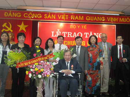 Phó Chủ tịch nước và Bộ trưởng Bộ Y tế trao tặng Huân chương Lao động và hoa cho ông Vũ Quý Nhân và ông Lê Tiến Thiện (bên trái). (Ảnh: Chí Cường). |