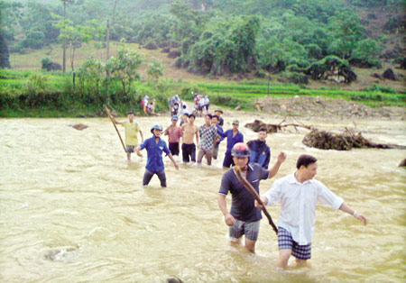 Có lẽ phải trải qua quãng đường ấy thì mới cảm nhận được hết nỗi gian nan nhưng rất dũng cảm của người dân nơi đây nói chung và các thầy, cô giáo trường Sùng Đô nói riêng. Chỉ cách thị xã Nghĩa Lộ chừng 10km nhưng mất gần nửa ngày, chúng tôi cùng thầy cô mới đến được trường Sùng Đô. Đường vào trường không chỉ xấu bởi những đoạn đường đất trơn trượt, sình lầy như muốn kéo người xuống mà còn bởi sự khúc khuỷu, ngoằn ngoèo một bên là vực sâu, một bên là triền núi. Đặc biệt, phải cùng nhau vác xe qua 2 con suối nước chảy xiết. “Khi cây cầu còn, chúng tôi đi lại không gặp nhiều khó khăn. Nhưng trận bão vừa rồi đã làm hỏng cầu, nước chảy mạnh, đi bộ đã khó chứ không nói đến vác thêm xe đạp hay xe máy. Nhiều thầy cô đi đến nửa chừng bị ngã mà phải bỏ về” – thầy giáo Hoàng Đình Tuyền, Hiệu trưởng trường Sùng Đô chia sẻ.
