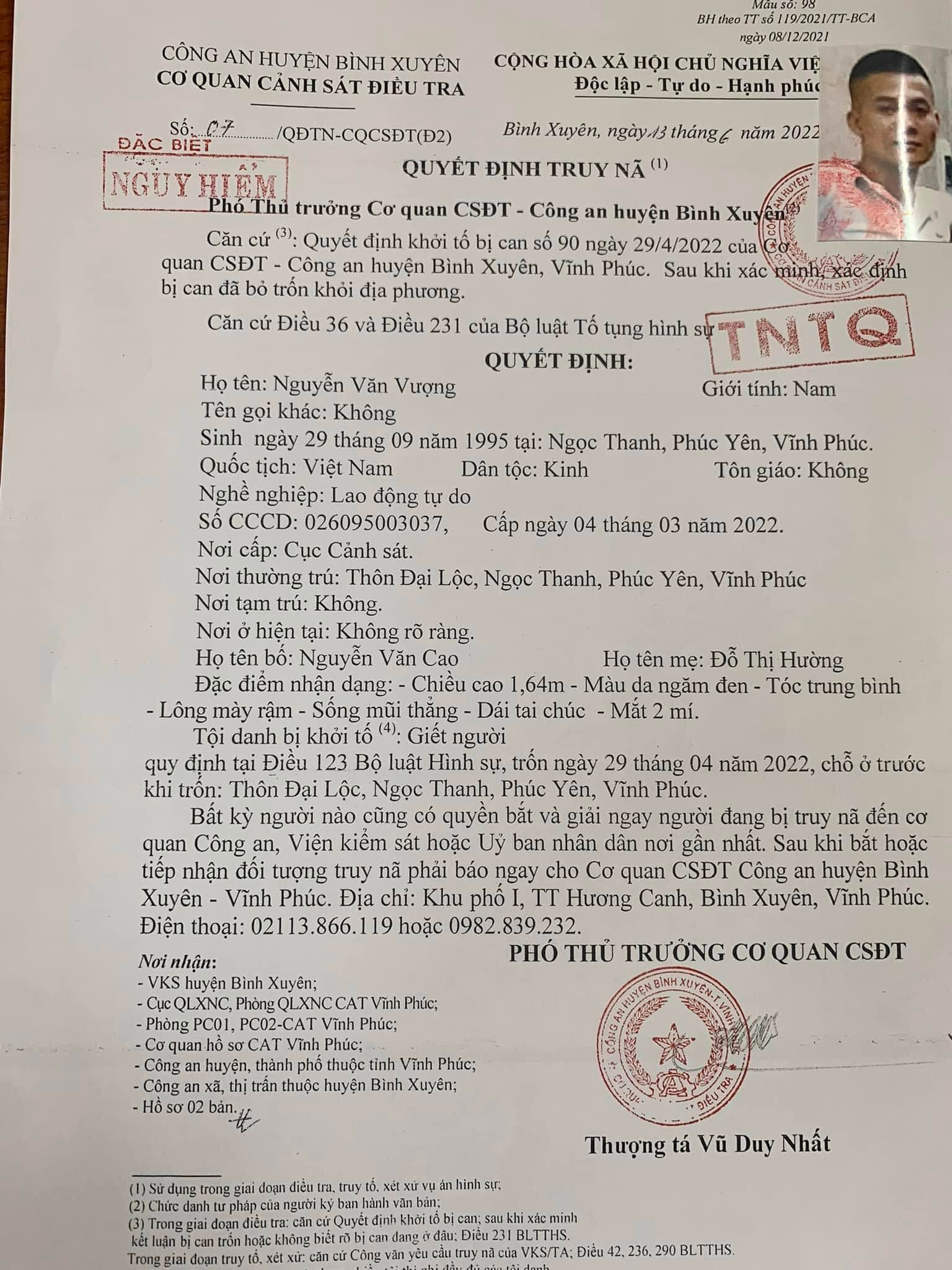 Ngày 13/6, Cơ quan Cảnh sát điều tra Công an huyện Bình Xuyên (Vĩnh Phúc), phát lệnh truy nã đặc biệt nguy hiểm đối với Nguyễn Văn Vượng (27 tuổi, trú tại thành phố Phúc Yên, tỉnh Vĩnh Phúc) về tội "Giết người".